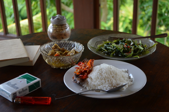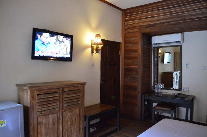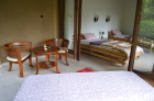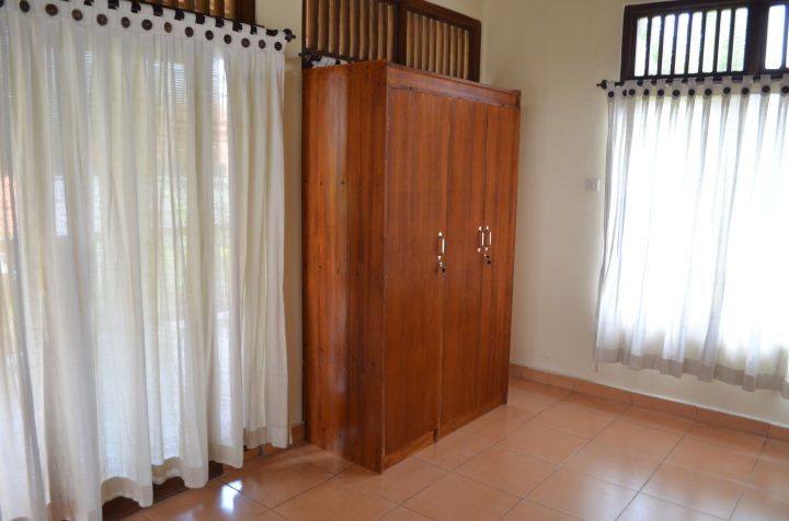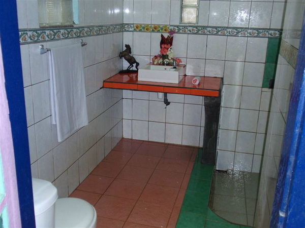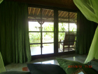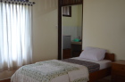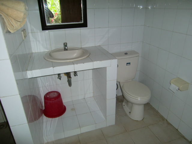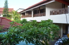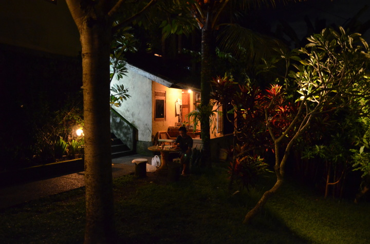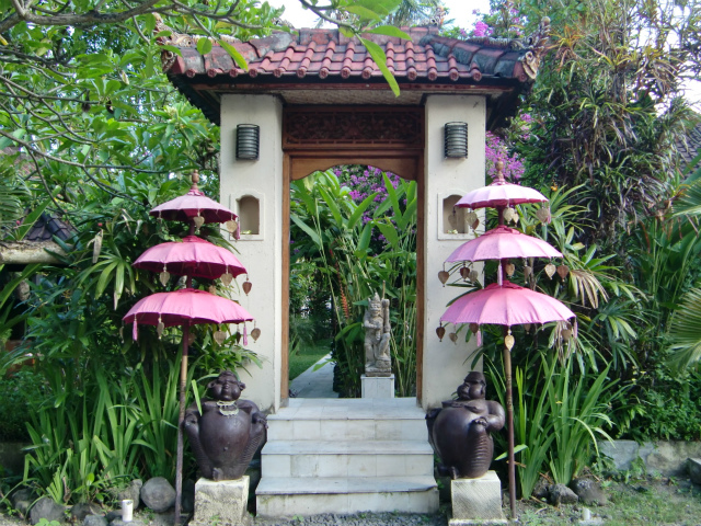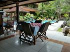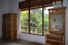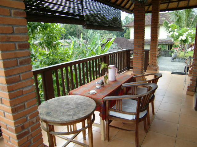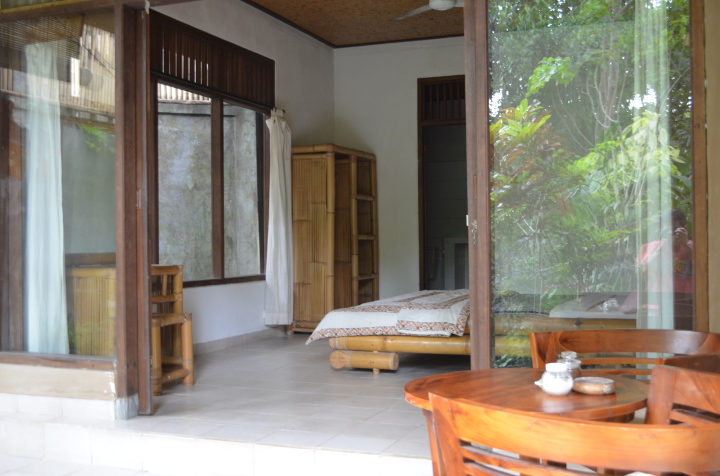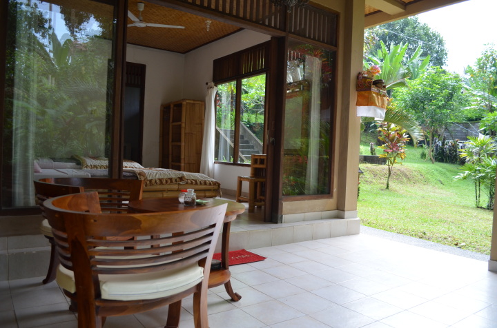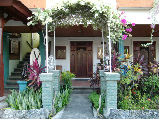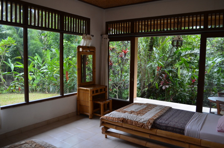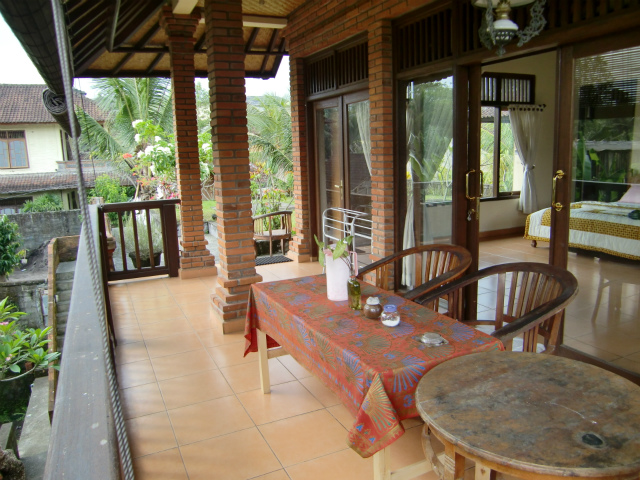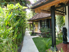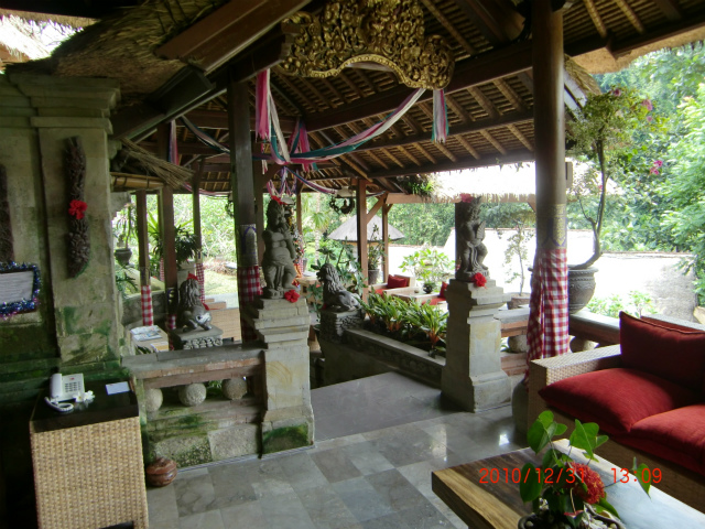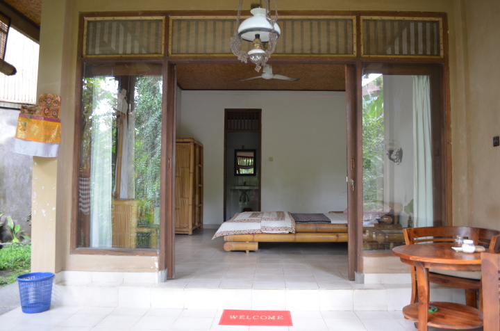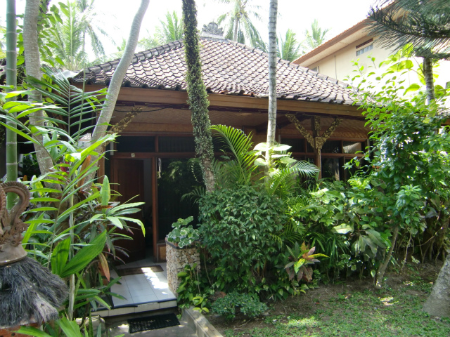 | モンキーフォレストから王宮通りに向かい徒歩5分。道沿い左手に小さめの看板が出てます。コンビニ(Circle-K)のすぐ先を左に入ると、50メートル先です。こじんまりしたバンガロウですが、敷地内はとても綺麗に整備されています。部屋の種類はスタンダードルーム(4室/ダブル2部屋・ツイン2部屋))とヴィラルーム(1室)があり、どちらも価格もすごく低料金です。ヴィラルームはスタンダードルームから離れているので、ディナーパーティーなんかも出来ちゃいます。キッチンや冷蔵庫もあり、とてもいい感じです。 ※宿泊料金 スタンダードルーム 185,000rp(約1,700円) ヴィラルーム 285,000rp(約2,600円) 朝食付き ・・・2012年4月時点 |
