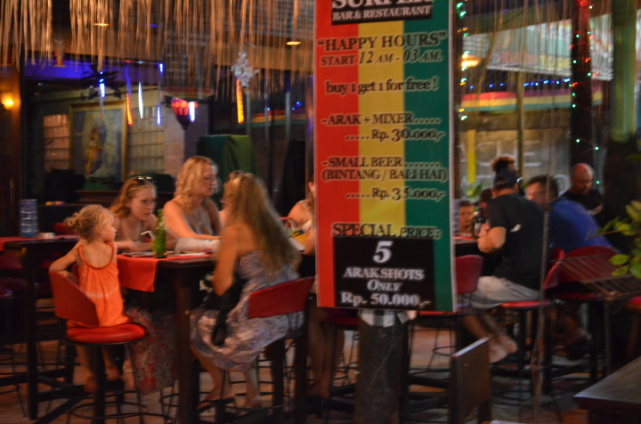 夜のレギャンは、サーフィンを終えたサーファー達や若い旅行者たちが集まり昼間とは違った雰囲気の街になります。午後6時ごろから各お店は夜の準備であわただしくなります。実際は午後9時すぎないと人は増えてきませんが、夕方からは各クラブからは大きな音楽が流れ始めたり若い女性店員が店頭で呼び込みを始めたりします。クラブでは夜の12時から1時頃がピークとなりレギャンは超盛り上がります。(バリの六本木的な感じ!?)クラブやレストランの料金もほかのエリアよりは少し高めですが、それでも夕食程度ならビールを飲んでも1,000円程度で十分楽しめます。