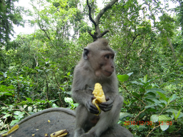 お猿さんの餌となるモンキーバナナは入口で販売しています。 サルも慣れたもので人間を見るとバナナって感じです。バナナを持っていないと、近寄ってもきません。でも、楽しい時間がすごせます。涼しいし。 |