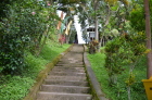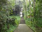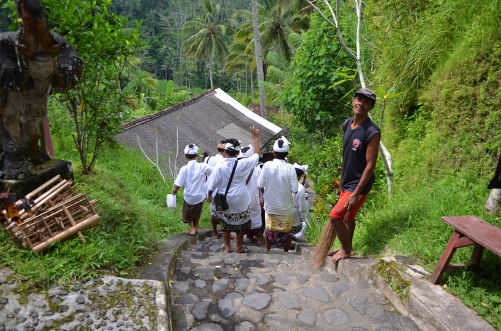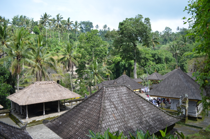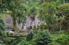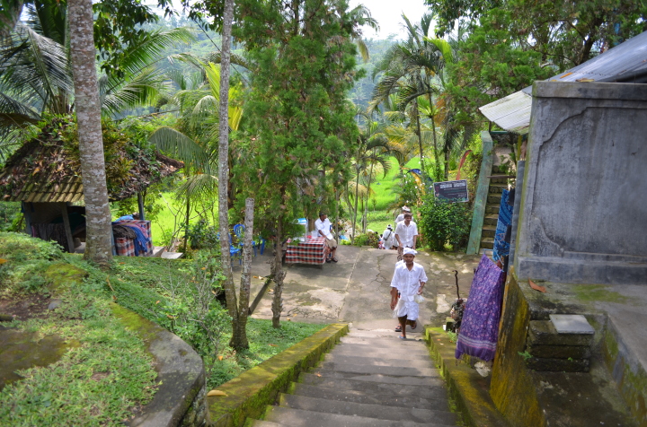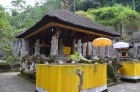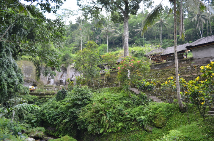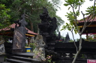 | この寺院は、ウブドから約20分位に位置し、バリ島の中でも美しい寺院として知られています。このお寺は山間の谷間に建てられており、自然豊かな緑多き寺院として有名です。谷間にあることから、入り口から寺院にたどり着くまでは、石の階段を延々と下り15分ほどでやっとたどり着きます。寺院のすぐわきには川が流れており、この川で体を清めていく地元の人もいます。 |
