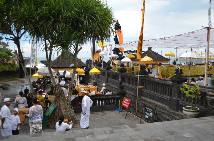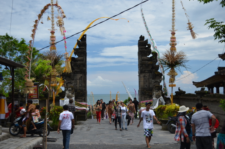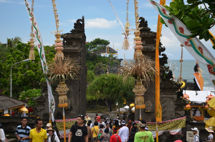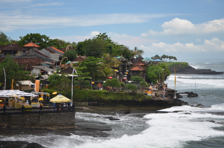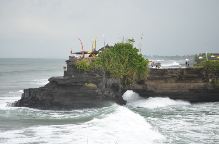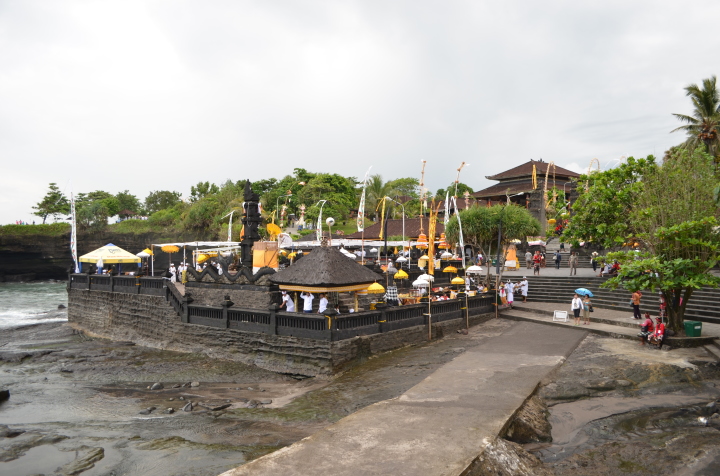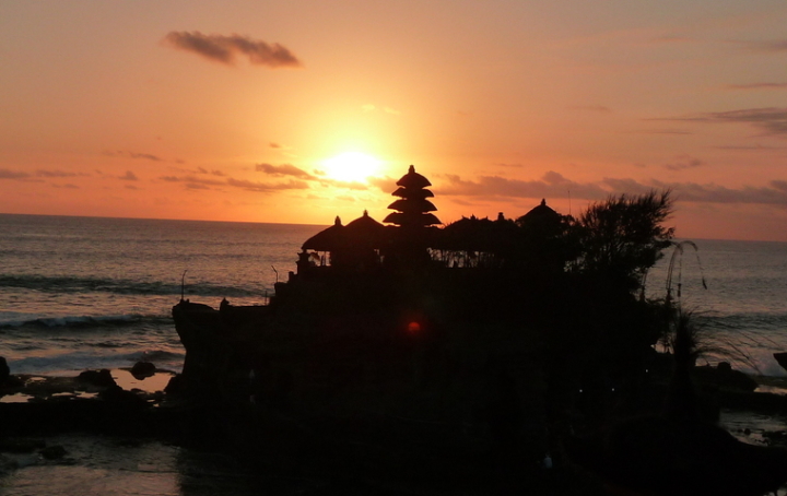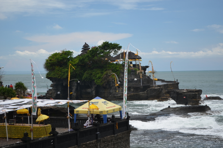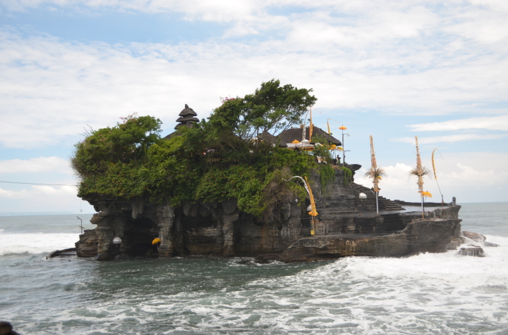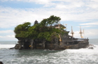 | タナロット寺院は、インドネシア・バリ島中西部の海岸にある寺院でバリ六大寺院のひとつです。干潮時には陸続きとなり、歩いて渡ることができます。夕暮れ時には美しいシルエットを形成し、多数の観光客が訪れています。エルニーニョ現象による海面の上昇などが原因で、海岸の浸食が進んでいましたが、日本のODAによる景観を再生するプロジェクトが行われています。名前の由来は、真ん中の土地という意味のトゥンガ・ロットが変化したものといわれています。また、通称ロックテンプルとも呼ばれています。 ※夕方からの時間帯は夕日を見に来る旅行客が増えますので大変込み合います。 |