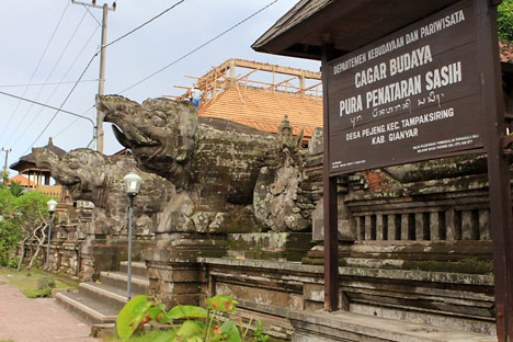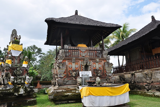 | プナタランサシ寺院(Pura Penataran Sasih)寺院は、ウブドの北東ペジェン村にある寺院で、バリ島6大寺院の一つに数えられる由緒正しい寺院です。ただし、他の寺院のように建立者や建立された正確な時期ははっきりしておらず、謎が多い寺院でもあります。この寺院は、“ペジェンの月”と言われる伝説にまつわる大きな銅鼓が祀られている事で有名ですが、 この銅鼓は紀元前3世紀頃のものとされ、東南アジアの青銅器時代を代表する遺物です。銅鼓の直径は160cm、高さは186cmと大きなもので、青銅製の銅鼓としては世界最大で、歴史的にも非常に重要なものです。 |