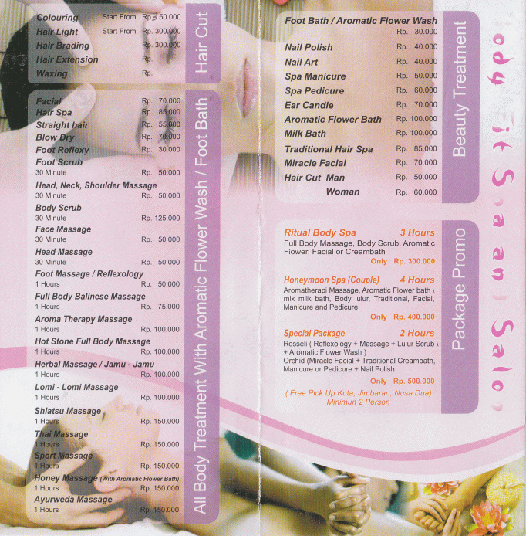 | このお店は、ウブドに滞在中にほぼ毎日行くスパです。ホテルや有名スパのように高級感はありませんが、オーナーをはじめスタッフの皆さんはとても親切でフレンドリーな方々ばかりです。高級スパに負けない技術力!もしかすると高級スパよりも上!?かもしれません。料金もかなり安く、フルボディーで60,000Rp(600円)。毎日通ってツルツルに! ボディトリートメント、フェイシャル、ヘアトリートメント、脱毛などメニューは豊富でどれも格安です。特にヨーロッパやオーストラリアのお客さんが多いようです。夕方になると大変込み合いますので、お昼時が狙い目です。ホテルなどのスパと比べると10分の1くらい!行かないと損しますよ! |
